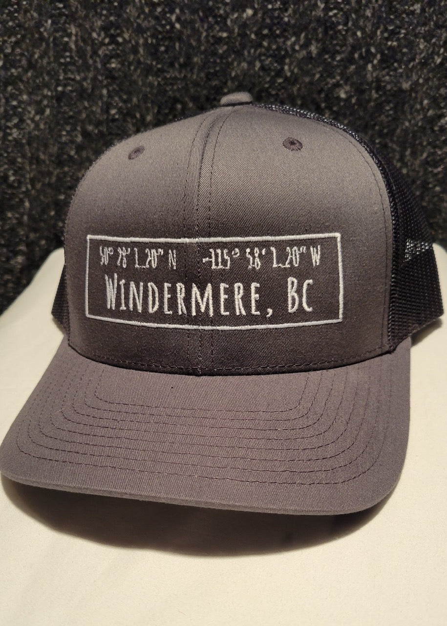 High Quality trucker hat with Lake Windermere, BC coordinates. Coming Soon as we sold out !